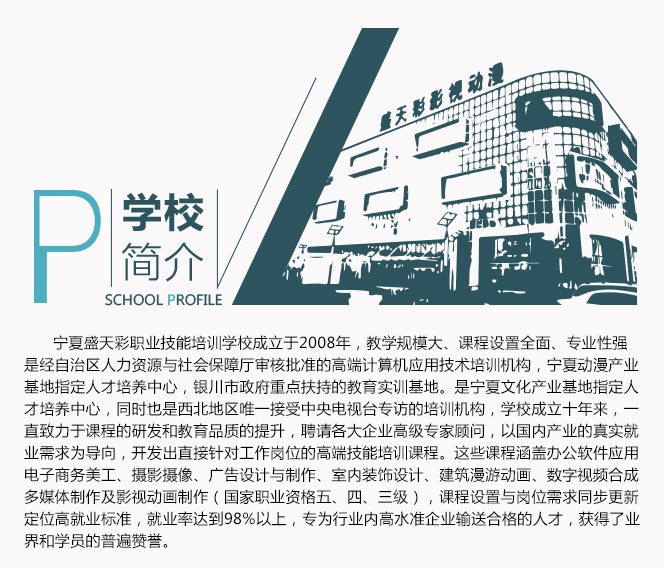 寧夏盛天彩職業(yè)技能培訓(xùn)學(xué)校是經(jīng)自治區(qū)人力資源與社會保障廳審核批準(zhǔn)的寧夏地區(qū)成立最早、教學(xué)規(guī)模最大設(shè)置課程最全面、專業(yè)性最強(qiáng)的數(shù)字藝術(shù)培訓(xùn)機(jī)構(gòu),是銀川市政府重點扶持的動畫教育實訓(xùn)基地,寧夏文化創(chuàng)意產(chǎn)業(yè)基地指定人才培養(yǎng)中心,也是西北地區(qū)唯一接受中央電視臺專訪的高技能人才培育機(jī)構(gòu)。